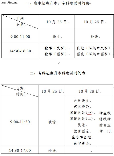 成人高校招生全国统一考试日期为10月下旬的最后一个周六、周日(即10月25日、10月26日)。具体时间及考试科目如下: